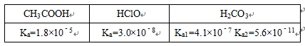 由表格可知,酸性的强弱顺序为CH3COOH >H2CO3> HClO>HCO3-,大于A中相同浓度CH3COONa和NaClO的混合液中,由于醋酸酸性强于次氯酸,则NaClO的水解程度CH3COONa,则溶液中c(CH3COO﹣) >c(ClO﹣),;B、由于酸性H2CO3> HClO>HCO3-,则向NaClO溶液中通入少量二氧化碳的离子方程式为:ClO﹣+CO2+H2O═HClO+HCO3﹣;C、由图象可知,稀释过程中,Ⅰ的变化程度更大,则Ⅰ为酸性更强的CH3COOH,