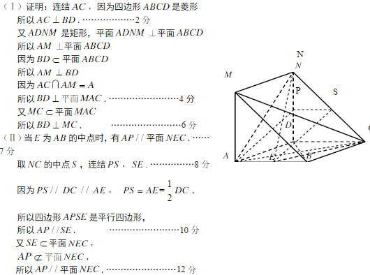 (2)在线段AB上是否存在点E,使得AP//平面NEC,若存在,说明其位置,并加以证明;若不存在,请说明理由.
