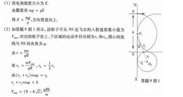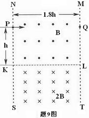 如题9图所示,在无限长的竖直边界NS和MT间充满匀强电场,同时该区域上、下部分分别充满方向垂直于NSTM平面向外和向内的匀强磁场,磁感应强度大小分别为B和2B,KL为上下磁场的水平分界线,在NS和MT边界上,距KL高h处分别有P、Q两点,NS和MT间距为1.8h。质量为m、带电量为+q的粒子从P点垂直于NS边界射入该区域,在两边界之间做圆周运动,重力加速度为g。
