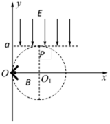 如图所示,在坐标系xOy所在平面内有一半径为a的圆形区域,圆心坐标O1(a , 0),圆内分布有垂直xOy平面的匀强磁场。在坐标原点O处有一个放射源,放射源开口的张角为90°,x轴为它的角平分线。带电粒子可以从放射源开口处在纸面内朝各个方向射出,其速率v、质量m、电荷量+q均相同。其中沿x轴正方向射出的粒子恰好从O1点的正上方的P点射出。不计带电粒子的重力,且不计带电粒子间的相互作用。