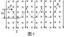 如图5所示,空间存在足够大、正交的匀强电、磁场,电场强度为E、方向竖直向下,磁感应强度为B、方向垂直纸面向里。从电、磁场中某点P由静止释放一个质量为m、带电量为+q的粒子(粒子受到的重力忽略不计),其运动轨迹如图5虚线所示。对于带电粒子在电、磁场中下落的最大高度H,下面给出了四个表达式,用你已有的知识计算可能会有困难,但你可以用学过的知识对下面的四个选项做出判断。你认为正确的是( )