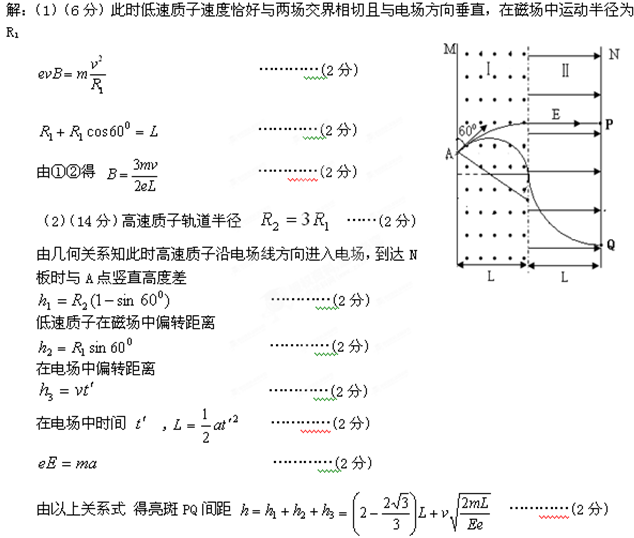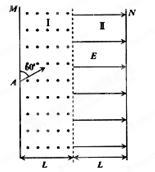 26.如图所示,真空室内竖直条形区域I存在垂直纸面向外的匀强磁场,条形区域Ⅱ(含I、Ⅱ区域分界面)存在水平向右的匀强电场,电场强度为E,磁场和电场宽度均为L且足够长,M、N为涂有荧光物质的竖直板。现有一束质子从A处连续不断地射入磁场,入射方向与M板成60°夹角且与纸面平行如图,质子束由两部分组成,一部分为速度大小为