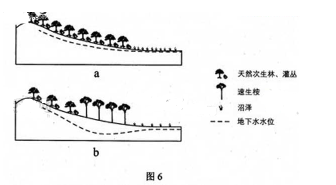 原产澳大利亚东北部热带雨林中的几种高大按树,主根深扎地下,能大圣吸收地下水·这几种桉树适应性强,生长迅速,3-5年即可成材,统称“速生桉”,.我国西南地区某地引种速生桉作为造纸原料。图6中a、b分别示意该地速生桉种植前、后的变化。
