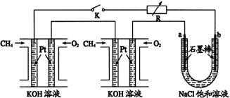 26.某研究小组将两个甲烷燃料电池串联后作为电源,进行饱和氯化钠溶液电解实验,如图所示U形管中氯化钠溶液的体积为800ml。闭合K后,若每个电池甲烷用量均为0.224L(标况),且反应完全,则理论上通过电解池的电量为 (法拉第常数F=9.65×104C/mol),若产生的气体全部逸出,电解后溶液混合均匀,电解后U形管中溶液的pH为 。