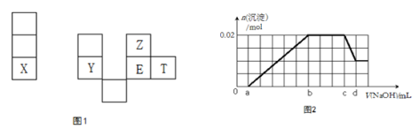 X、Y、Z、E、T均为短周期元素,在周期表中的相对位置如图1。X是短周期中原子半径最大的元素; X、Y在同一周期,Y是常见的半导体材料; E的最高价氧化物对应水化物有强脱水性。
