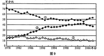 17.图9为辽宁省1978年-2007年三大产业产值构成变化图,图中表示第一、二、三产业变化的曲线分别是( )