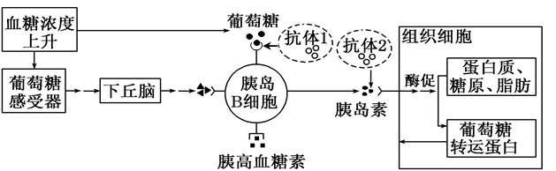 61. 糖尿病病因之一是患者血液中存在异常抗体(抗体1、抗体2)。图中因_______(抗体1/抗体2)引起的糖尿病可以通过注射胰岛素来治疗。这种抗体导致患者体内血糖上升的原因是_______。