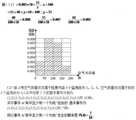 (2)若A市共有5个监测点,其中有3个监测点为轻度污染,2个监测点为良.从中任意选取2个监测点,事件A“其中至少有一个为良”发生的概率是多少?