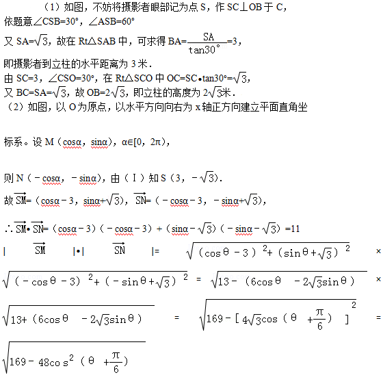 (2)立柱的顶端有一长2米的彩杆MN绕中点O在S与立柱所在的平面内旋转。摄影者有一视角范围为60°的镜头,在彩杆转动的任意时刻,摄影者是否都可以将彩杆全部摄入画面?说明理由。