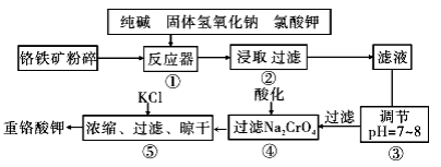 重铬酸钾是工业生产和实验室的重要氧化剂,工业上常用铬铁矿(主要成分为FeO·Cr2O3,杂质为SiO2、Al2O3)为原料生产,实验室模拟工业法用铬铁矿制K2Cr2O7的主要工艺如下图。涉及的主要反应是: 6FeO·Cr2O3+24NaOH+7KClO3=12Na2CrO4+3Fe2O3+7KCl+12H2O。