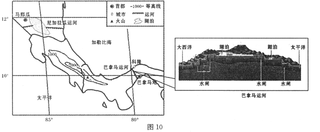 (2)合理。缓解巴拿马运河的运输压力;缩短巨型轮船从大西洋到太平洋的运输距离,提高运输能力;巴拿马运河需船闸运输,浪费资源和时间,新建运河会节约资源和过河时间;拉动就业,带动尼加拉瓜运河沿河经济发展。