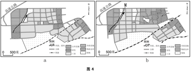 12. 图4a是2005年某城市新区规划图。针对规划实施中出现的一些问题,2010年对原规划进行了修编(图4b)。该城市盛行西北风。在图4b中的M处适宜修建( )