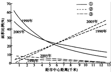 14.下图为我国某城市工业、商业和居住用地比例时空变化示意图。2005年与l990年相比,距市中心12千米处( )
