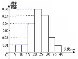 13. 某棉纺厂为了了解一批棉花的质量, 从中随机抽取了100根棉花纤维的长度(棉花纤维的长度是棉花质量的重要指标),所得数据都在区间[5,40]中,其频率分布直方图如图所示.从抽样的100根棉花纤维中任意抽取一根,则其棉花纤维的长度小于20mm的概率为______.