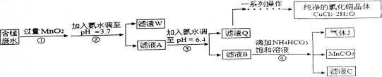 利用酸性含锰废水(主要含Mn2+、Cl-、H+、Fe2+、Cu2+)可制备高性能磁性材料碳酸锰(MnCO3)及纯净的氯化铀晶体(CuCl2·2H2O)。工业流程如下: