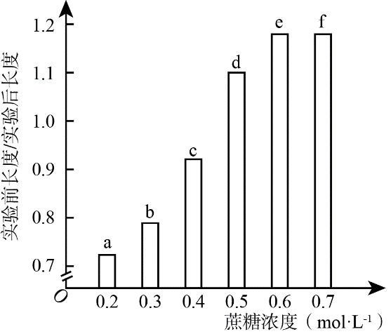 将某植物花冠切成大小和形状相同的细条,分为a、b、c、d、e和f组(每组的细条数相等),取上述6组细条分别置于不同浓度的蔗糖溶液中,浸泡相同时间后测量各组花冠细条的长度,结果如图所示。假如蔗糖溶液与花冠细胞之间只有水分交换,则