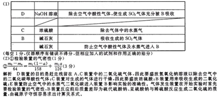 (1)请填写下表(按仪器连接顺序由上到下依次填入,各仪器只能使用一次)。可供选用的试剂有品红溶液、NaOH溶液、浓硫酸、无水硫酸铜、碱石灰。
