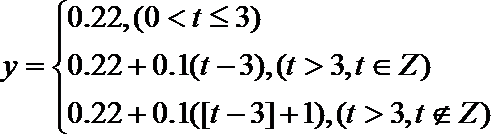 第二步:如果t≤3,那么y = 0.22;否则判断t∈Z 是否成立,若成立执行y= 0.2+0.1× (t-3);否则执行y = 0.2+0.1×( [t-3]+1)。