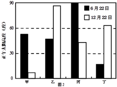 3.图2为6月22日与12月22日地球表面四地正午太阳高度。