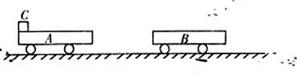 23.(10分)两相同平板小车A、B放在光滑水平面上,两小车质量均为2kg,车长0.3m,A车左端放一小铁块C,质量为1kg,铁块与小车表面的摩擦因数均为0.4,开始A、C一起以v0=4m/s滑向静止的B车,A、B碰撞后粘在一起,求: