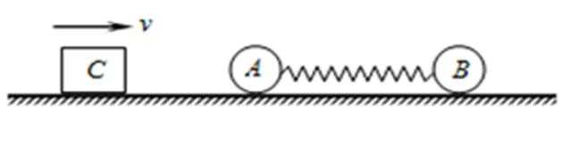 37.如图,在光滑水平面上有A、B两个小球,质量分别为mA=2m、mB=m,A、B之间用一轻弹簧相连。开始时A、B处于静止状态,弹簧处于原长。现给滑块C一个水平向右的初速度v,质量mC=3m,某时刻C与A发生弹性正碰,求: