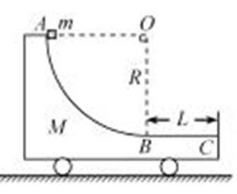 21.如图,质量为M的小车静止在光滑的水平面上,小车AB段是半径为R的四分之一圆弧光滑轨道,BC段是长为L的水平粗糙轨道,两段轨道相切于B点,一质量为m的滑块在小车上从A点静止开始沿轨道滑下,重力加速度为g。