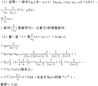 19.在数列{an}中a1=1,3anan-1+an-an-1=0(n≥2).数列{bn}满足bn=an·an+1,Tn为数列{bn}的前n项和。