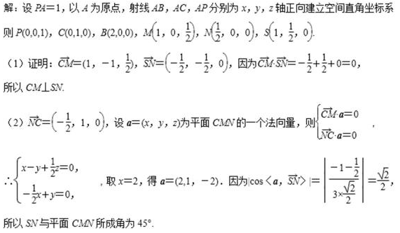 18.已知三棱锥PABC中,PA⊥平面ABC,AB⊥AC,PA=AC=AB,N为AB上一点,AB=4AN,M,S分别为PB,BC的中点.