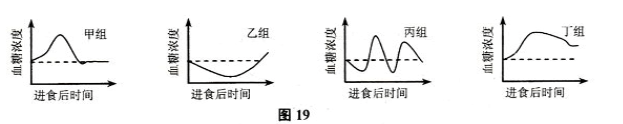 肥胖可能导致糖尿病,为了研究新药T对糖尿病的疗效,需要创建糖尿病动物模型。科学研究中常用药物S创建糖尿病动物模型。给甲、乙、丙、丁4组大鼠注射药物S,图19显示各组大鼠进食后血糖浓度的变化,虚线表示基础血糖值。