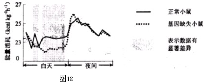 G基因可能与肥胖的产生有关,某研究用高脂肪食物喂养G基因缺失小鼠和正常小鼠8周后,发现基因缺失小鼠的体重明显大于正常小鼠,测量两种小鼠的能量消耗,结果见图18。