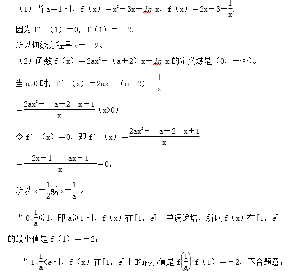 (2)当a>0时,若f(x)在区间[1,e]上的最小值为-2,求a的取值范围;