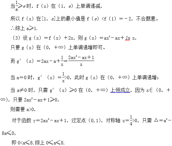 (3)若对任意x1,x2∈(0,+∞),x1<x2,且f(x1)+2x1<f(x2)+2x2恒成立,求a的取值范围。