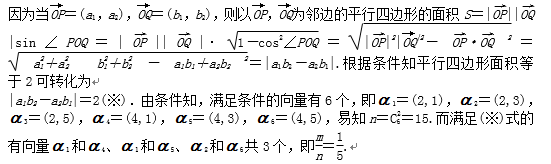 在集合{1,2,3,4,5}中任取一个偶数a和一个奇数b构成以原点为起点的向量α=(a,b),从所有得到的以原点为起点的向量中任取两个向量为邻边作平行四边形,记所有作成的平行四边形的个数为n,其中面积等于2的平行四边形的个数为m,则
