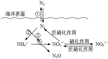 (1)海洋中的氮循环起始于氮的固定,其中属于固氮作用的一步是 (填图中数字序号)。