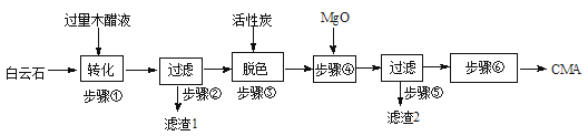 CMA(醋酸钙、醋酸镁固体的混合物)是高速公路的绿色融雪剂。以生物质废液——木醋液(主要成分乙酸,以及少量的甲醇、苯酚、焦油等杂质)及白云石(主要成分MgCO3·CaCO3,含SiO2等杂质)等为原料生产CMA的实验流程如下: