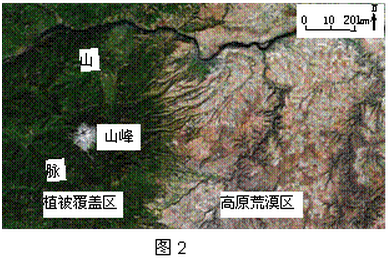 4. 图2为45ºN 附近某区域的遥感影像,共中深色部分为植被覆盖区,浅色部分为高原荒澳区;终年冰雪覆盖的山峰海拔3424米,距海约180千米.读图2。
