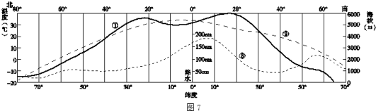 16.图7显示了全球不同纬度多年平均雪线高度、气温、降水量的分布。据图可判断( )