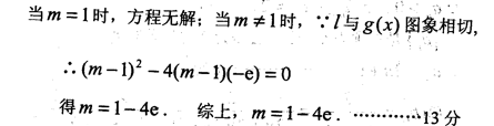 (2)若直线l与函数f(x),g(x)的图象都相切,且与函数f(x)的图象相切于点(1,0),求m的值。