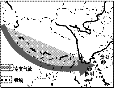 24.北半球西风气流受青藏高原阻挡,分为南北两支,冬季,西风气流南移,其南支气流沿青藏高原南缘向东移动,带来暖湿气流,读图,在图示天气系统控制下,昆明可能出现的天气状况为( )