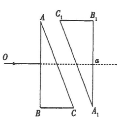 36.如图所示,两块同样的玻璃直角三棱镜ABC和A1B1C1,∠A=∠A1=30°,AC面和A1C1面平行,且A、B1、C1在一条直线上,两三棱镜放置在空气中,一单色细光束O垂直于AB面入射,光线从A1B1面射出时,出射光线方向与入射光线O的方向平行.若玻璃的折射率n=