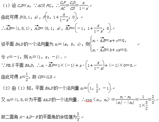 如图,在直三棱柱ABC-A1B1C1中,∠BAC=90°,AB=AC=AA1=1,D是棱CC1上的一点,P是AD的延长线与A1C1的延长线的交点,且PB1∥平面BDA1。