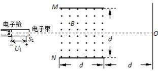 21.如图所示,在电子枪右侧依次存在加速电场,两水平放置的平行金属板和竖直放置的荧光屏。加速电场的电压为U1。两平行金属板的板长、板间距离均为d。荧光屏距两平行金属板右侧距离也为d。电子枪发射的质量为m、电荷量为–e的电子,从两平行金属板的中央穿过,打在荧光屏的中点O。不计电子在进入加速电场前的速度及电子重力。