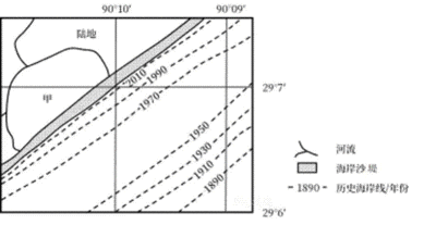 图1示意北美东南部沿海冲积平原某区域1890年以来海岸线的变化。读图1,完成7 ~ 8题。