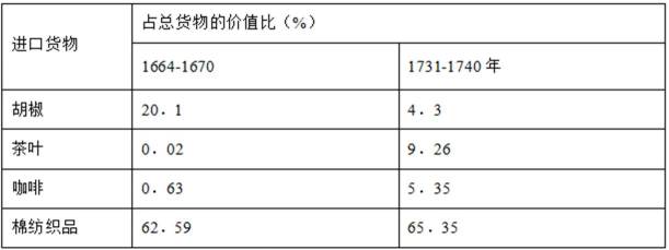 表1是学者统计的17-18世纪英国东印度公司进口的部分亚洲货物价值占比。据表可知,该时期( )