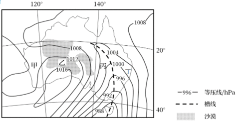 (2)丙; 丙位于高压中心及沙漠东侧,以偏西风为,且风力较大,沙尘主要吹向丙地。