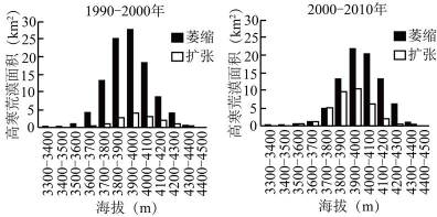 高寒荒漠是祁连山垂直带谱的组成部分,对气温变化响应敏感。祁连山冷龙岭海拔3300-4400米为高山草甸与高寒荒漠的交错地带。下图示意1990-2010年祁连山冷龙岭不同海拔高寒荒漠的变化情况。据此完成下面小题。