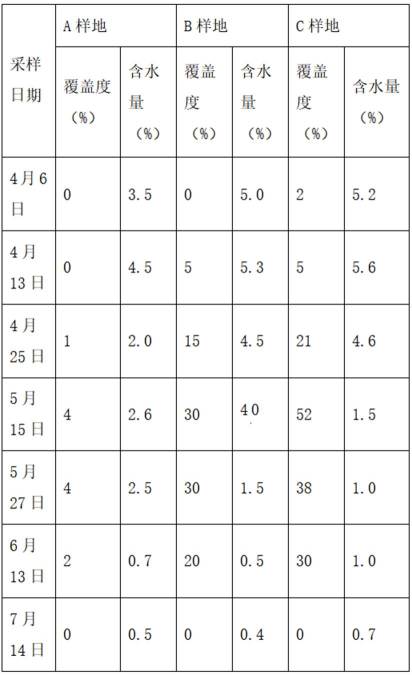 在一条典型沙垄上选定A、B、C三个采样地(下图)、合理设置样方,通过日测获取植被覆盖度,在样方中采集20cm深度的土壤样品,密封后送实验室测量样品土壤含水量。在4—7月分7次按同样的方法进行采样调查。
