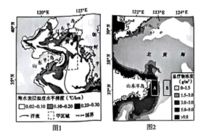 (1)简述图1中甲区域冬季海洋温度锋的空间分布,并分析该季节海洋温度锋显著的原因。