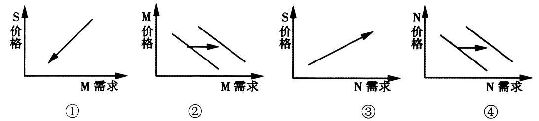 由于中澳自由贸易协定正式生效并降税,由澳大利亚进口到我国的S商品价格降低,需求增加,而其替代品M的需求则会减少,①所示经济关系符合材料;其互补品N的价格不变但是需求会增加,④符合;②③不符合材料。所以正确答案为B.