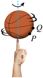 “指尖转球”是花式篮球表演中常见的技巧。如图,当篮球在指尖上绕轴转动时,球面上P、Q两点做圆周运动的( )